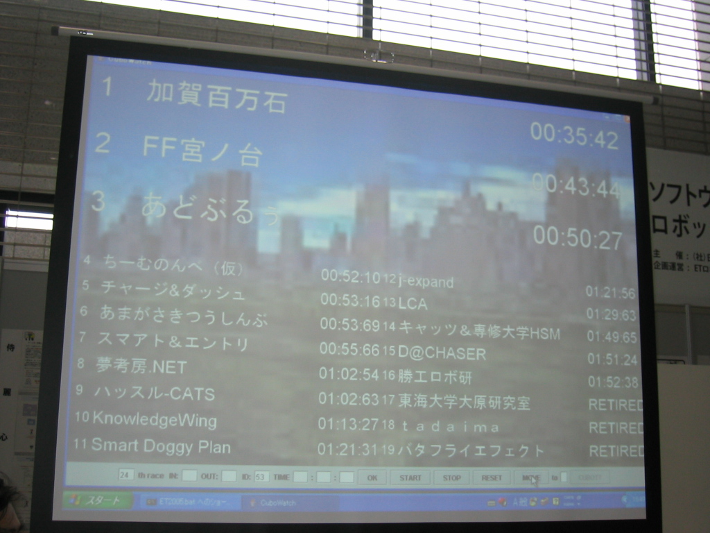 1分を切る程度を目標に,駆動モータ速度MAXの誓いを泣く泣くあきらめ, 90%速度で攻めることになりました。 ~2走目: さて,安全走行だしと力を抜いて向かうべき2走目ですが, 本日一度も完走してないので,あせりはあります。 会場で他チームの走行を見ていると,スターターの影で 誤認識(しかもゴール前)でリタイアすることがあるように感じました。 「スタートしたらしゃがもう」ということを心がけ,スタート! …結果は53秒。思ったよりもずっと良い結果でした。 まずは完走できたことにホッとしています。 「終わった…」と思ってくつろいでいると, 会場が沸き,覗いてみると35秒台のチームが!(加賀百万石さん) おみごと!というべき内容です。 結果を出したチームがいると, 調整時間が…などとの言い訳は出来ません。完敗です。 とりあえず最終結果は6位でした。